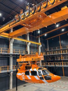 This Condra 4-ton overhead crane with suspended helicopter fuselage accurately replicates helicopter motion in the hover, allowing simulated but realistic training of emergency rescue teams.